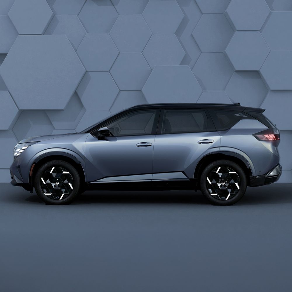 One Nissan Rogue Hybrid e-POWER side view in front of a backdrop that looks to have tiles.